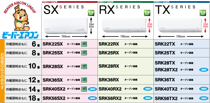 ビーバーエアコン2019年度モデルSX,RX,TXシリーズ:ルームエアコン
